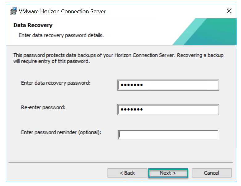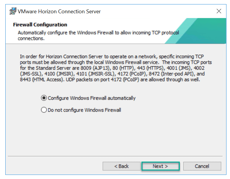 Note: By default, the installation process creates a self-signed SSL certificate to encrypt connections to the Horizon Connection Server. While the server will function with this default self-signed certificate installed, it is recommended you replace the default certificate with an approved certificate signed by a certificate authority.
