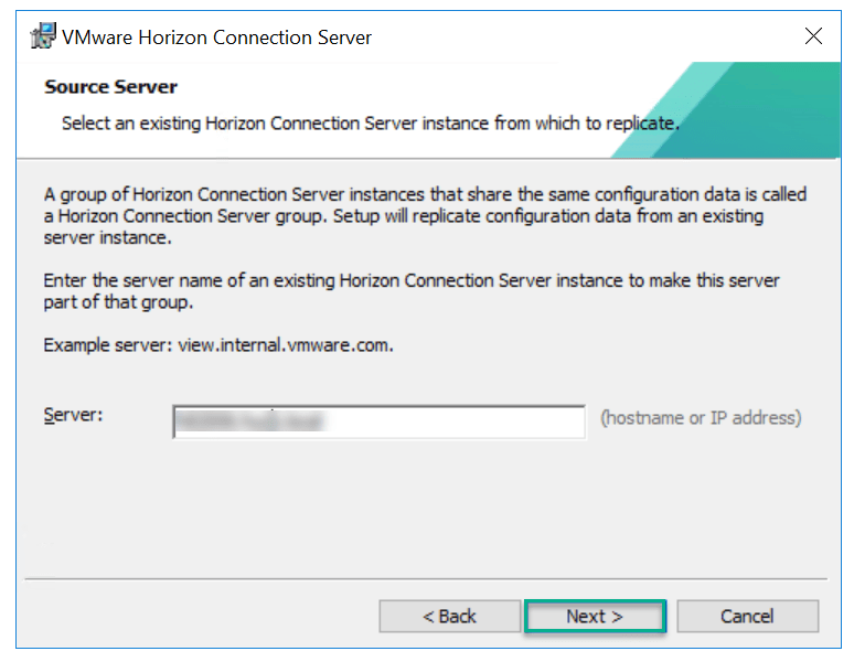 - On the Source Server page, enter an existing Horizon Connection Server and click Next.