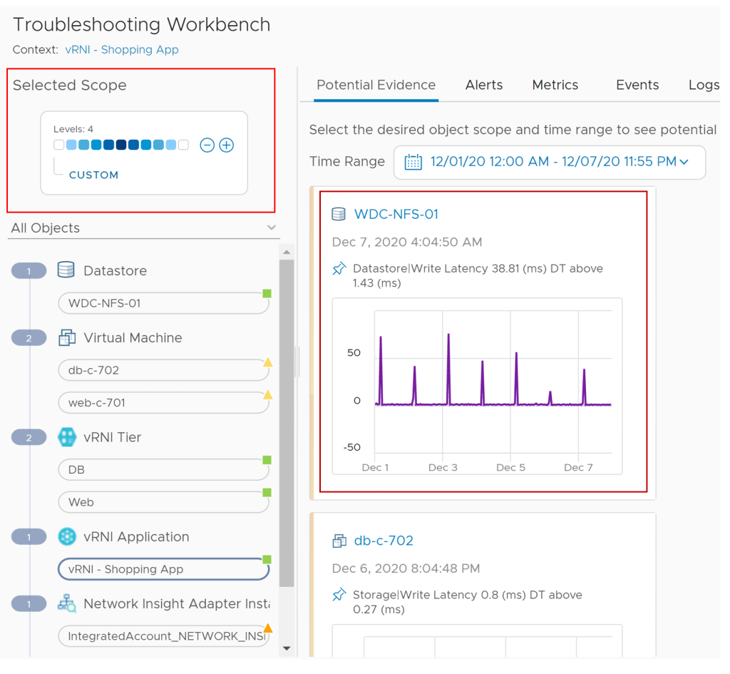 We can even increase the scope (levels) of the troubleshooting workbench, to see events, changes and anomalies related to underlying objects like Datastores, which these VMs are part of.